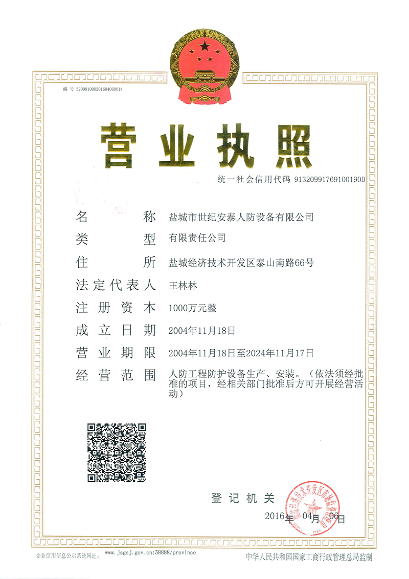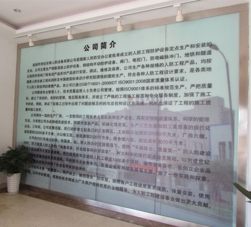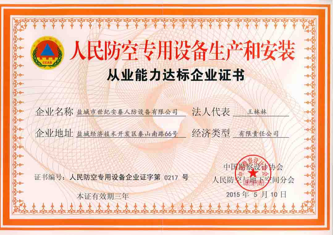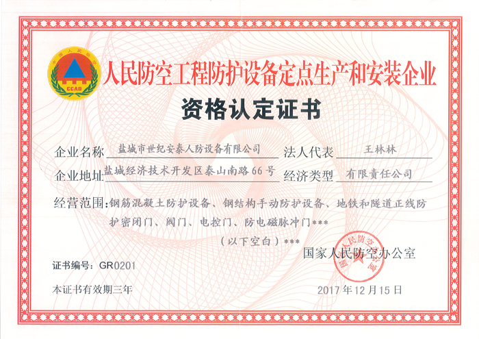 鹽城市世紀安泰人防設備有限公司是國家人民防空辦公室批準成立的人防工程防護設備定點生產和安裝企業,是專業生產、銷售、安裝人防防護設備產品的企業,公司主要生產鋼筋混凝土防護設備、鋼結構手動防護設備、閥門、電控門、防電磁脈沖門、地鐵和隧道正線防護密閉門等各類產品并對產品進行安裝、調試、維修及保養,公司生產的各種規格的人防工程產品,均按國家人防總參工程兵四所及中國建筑標準設計研究院提供的圖紙生產,符合各種人防工程設計要求,是各類地下人防工程選用的理想產品。本公司已通過GB/T19001-2008IDT ISO9001:2008國家質量體系認證。